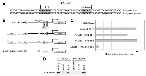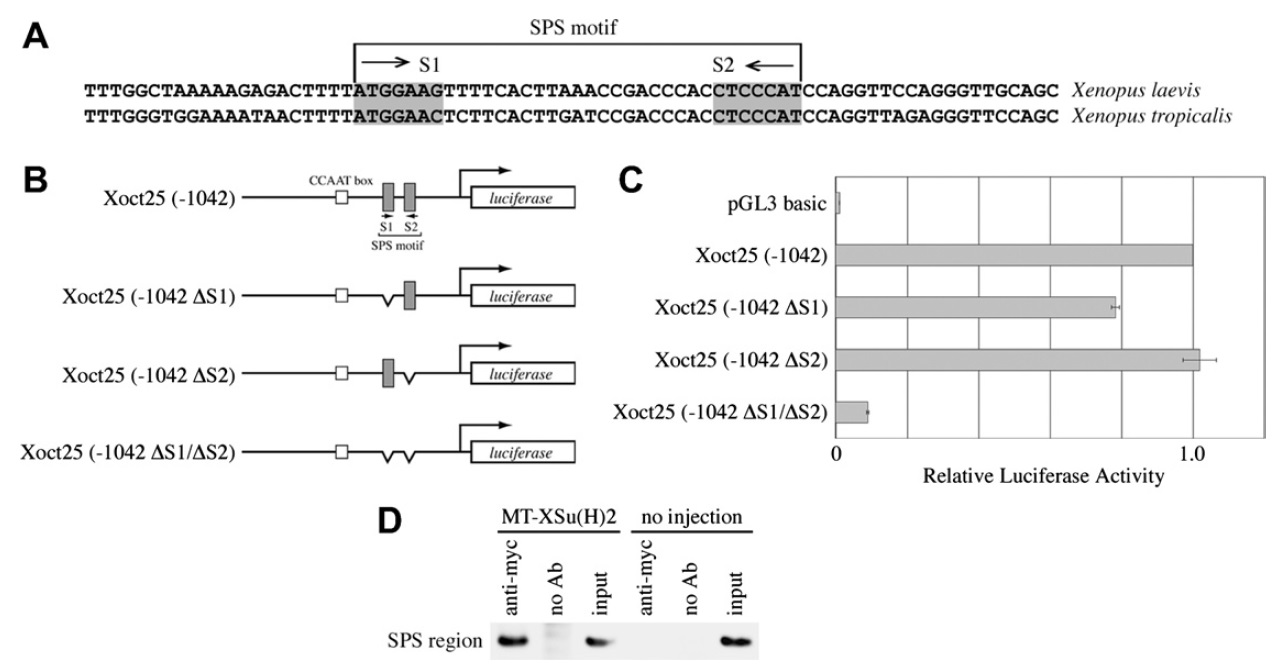calculating luciferase activity in the upstream of Xoct25 ( 1042) as 1. Experiments were carried out in triplicate. (D) Two nanograms MT-XSu(H)2 into
