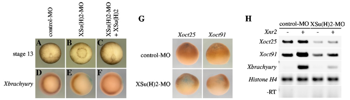 Fig. 1. XSu(H)2 depletion suppressed Xoct25 and Xoct91 expressions. (AâF) Effect of XSu(H)2 depletion on embryogenesis. Embryos were injected with