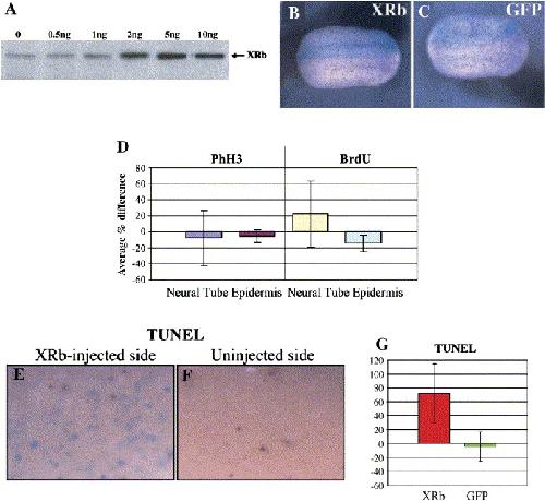 Fig. 4. Overexpression of XRb does not significantly affect the number of cells in mitosis or S phase in the neural tube or epidermis, or the number of apoptotic cells in the epidermis. (A) Embryos were injected in both blastomeres at the two-cell stage with increasing doses of XRb mRNA. Extracts made from stage 19 embryos were Western blotted and probed with an anti-human pRb antibody (XZ160) that cross-reacts with XRb. (B and C) Embryos were injected with 2 ng mRNA encoding XRb or GFP and β-galactosidase (blue) as a marker in one ventral cell at the four-cell stage. At stage 22 epidermal mitotic cells were stained by whole mount immunostaining (purple) with anti-phospho histone H3 antibody. Dorsal views; anteriors to the right; injected sides uppermost. (D) Embryos injected in one dorsal cell at the four-cell stage with 2 ng XRb mRNA and β-galactosidase (blue), with or without BrdU injection at stage 20, were sectioned and immunostained (purple) using anti-phospho histone H3 antibody to visualise mitotic cells or anti-BrdU antibody to visualise cells in S phase. The numbers of positive cells in both injected and uninjected sides of the neural tubes and the epidermis were counted in serial sections: graph shows the average percentage differences between the sides, with error bars showing standard errors (n = 6 embryos for each marker, average of 39 sections per embryo). XRb overexpression causes no significant difference in the number of mitotic cells on the injected side of the neural tube (average 8% decrease; p = 0.3) or in the epidermis (average 6% decrease; p = 0.2), or in the number of cells in S phase in the neural tube (average 22% increase; p = 0.5) or in the epidermis (average 15% decrease; p = 0.1). (E and F) Embryos injected with 2 ng XRb mRNA and β-galactosidase (blue) in one cell at the two-cell stage were fixed at stage 22 and apoptotic cells in the epidermis were visualised using whole mount TUNEL staining (purple). XRb overexpression has no effect on the density of apoptotic cells in the epidermis: XRb-injected side (E) and uninjected side (F) of the same embryo. (G) Apoptotic cells were counted in sample areas of the epidermis on both injected and uninjected sides of whole mount TUNEL-stained embryos. Graph shows the average percentage difference between the numbers of apoptotic cells on the two sides of embryos injected with XRb or GRP mRNA, with error bars showing standard errors. XRb overexpression does not make a significant difference to the number of apoptotic cells in the epidermis (average 72% increase; p = 0.09; n = 8); GFP injection also causes no difference (average 4% decrease; p = 0.28; n = 10).