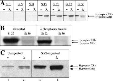 Fig. 6. XRb is predominantly hyperphosphorylated during Xenopus embryogenesis. (A) Extracts made from embryos at a range of stages between 1 and 30 were either untreated (−) or treated with lambda phosphatase (λ) and immunoblotted with anti-Rb antibody (XZ160). Endogenous Rb protein is detected at all stages between 8 and 30 in its hyperphosphorylated form (upper bands). (B) Extracts made from embryos at stage 22 (30 μg total protein) or stage 50 (50 μg total protein) were either untreated (−) or treated with lambda phosphatase (λ) and immunoblotted with anti-Rb antibody (XZ160). pXRb was predominantly hyperphosphorylated at stage 22 but exists in hyper- and hypophosphorylated forms at stage 50. (C) Extracts made from uninjected or XRb mRNA (2 ng)-injected embryos at stage 22 were either untreated (lanes 1 and 3) or treated with lambda phosphatase (lanes 2 and 4) and immunoblotted with anti-Rb antibody (XZ160). Both endogenous pXRb, seen in uninjected extracts (lanes 1 and 2), and exogenous pXRb, seen in extracts from XRb-injected embryos (lanes 3 and 4), are predominantly in the hyperphosphorylated form (upper bands) at stage 22. Hyperphosphorylated XRb (Hyperphos XRb); hypophosphorylated XRb (Hypophos XRb); stage (St).