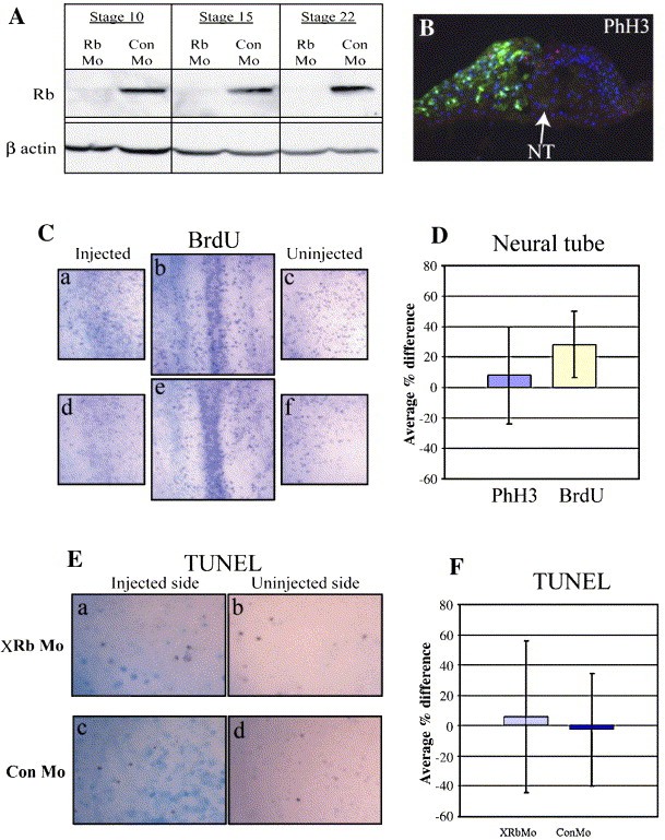 Fig. 2. XRb morpholino specifically depletes XRb protein but does not affect the number of cells in mitosis or S phase in the neural tube, or the number of cells undergoing apoptosis or S phase in the epidermis. (A) Embryos were injected with 20 ng XRb morpholino (Mo) or control Mo in both blastomeres at the two-cell stage. Extracts made from these embryos at stages 10, 15 and 22 were Western blotted and probed with anti-Rb antibody (XZ160). The same blot was stripped and probed with an anti-β-actin antibody to show equal loading. XRb Mo depletes XRb protein at all three stages, while control Mo does not affect its level. (B) Embryos were injected with 20 ng XRb Mo and β-galactosidase as a tracer (visible as green autofluorescence) in one dorsal cell at the four-cell stage. At stage 21, embryos were sectioned and immunostained using an anti-phospho histone H3 antibody to visualise mitotic cells (red fluorescence) in the neural tube (NT). Hoechst staining of nuclei (blue). (C) Embryos were injected in one cell at the two-cell stage with 20 ng XRb Mo (CaâCc) or control Mo (CdâCf) and β-galactosidase as a tracer (blue) and then injected with BrdU at stage 20. After 2 h they were fixed and epidermal cells in S phase were visualised by whole mount BrdU immunostaining (purple). There is no difference between the density of cells in S phase in the Mo-injected sides of the embryos (Ca and Cd) and their density in the uninjected sides of the same representative embryos (Cc and Cf). Dorsal views with injected sides on the left and uninjected sides on the right (Cb and Ce). (D) Embryos were injected with 20 ng XRb Mo, with or without subsequent BrdU injection (as in C), sectioned and immunostained with anti-phospho histone H3 or anti-BrdU antibody. The numbers of cells in mitosis or S phase in both injected and uninjected sides of the neural tubes were counted in serial sections (n = 6 embryos for each marker, average of 41 sections per embryo). Average percentage differences between the sides are shown, with error bars showing the standard errors. pXRb depletion results in no significant change in the number of mitotic cells on the injected side of the neural tube compared to the uninjected side (average 8% increase, p = 0.2), or in the number of cells in S phase (average 28% increase, p = 0.43). (E) Embryos injected with 20 ng XRb Mo (Ea and Eb) or control Mo (Ec and Ed) with β-galactosidase as a tracer (blue) in one cell at the two-cell stage were fixed at stage 22. Apoptotic cells in the epidermis were visualised by whole mount TUNEL staining (purple). (F) The numbers of TUNEL-stained cells were counted in sample areas on both the Mo-injected and uninjected sides. Average percentage differences between the sides are shown, with error bars showing the standard errors. Neither XRb Mo (p = 0.44; n = 10) nor control Mo injection (p = 0.1; n = 11) affects the number of apoptotic cells in the epidermis (cf. injected sides, Ea and Ec, with uninjected sides, Eb and Ed).