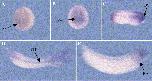 Fig. 1. Expression pattern of the Xenopus retinoblastoma gene. XRb expression was analysed by whole mount in situ hybridisation (stained in purple) in embryos at a range of stages. XRb is expressed in the anterior placodes (P) from stage 16 and increases by stage 19, especially in the optic vesicles (OV). Between stages 26 and 30, strong expression is seen in the optic vesicles, neural tube (NT) and branchial arches (BA). (A) Stage 16, anterior view; (B) stage 19, anterior view; (C) stage 26, lateral view; (D) stage 28, dorsal view; (E) stage 30, lateral view. Anteriors to the right (C, D, E).