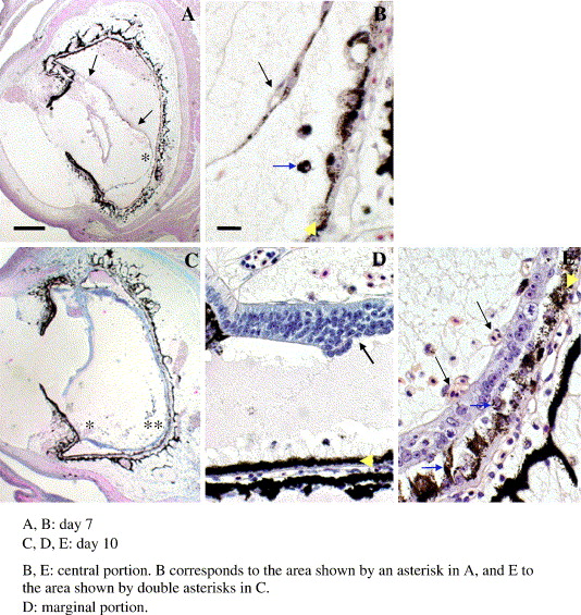 Fig. 2. An early stage of retinal regeneration in X. laevis eyes (3 months after metamorphosis). All images in this figure and in Fig. 3, Fig. 4, Fig. 5, Fig. 6, Fig. 7, Fig. 8, Fig. 9 and Fig. 10 are illustrated and placed in the same direction: the anterior (corneal) of the eye at the left and the posterior (scleral) at the right. The dorsal is at the upper. (A, B) Day 7 and (C, D, E) Day 10 after retinectomy. The area indicated by asterisk in (A) is shown in (B) at a higher magnification. Arrows indicate RVM (retinal vascular membrane). (B) Black arrow indicates RVM where pigmented cells form an epithelial monolayer sheet. Blue arrow indicates single pigmented cell located between the retinal pigmented epithelium (RPE) (indicated by yellow arrowhead) and the RVM. (C) The areas indicated by a single and by double asterisks in (C) are shown in (D) and (E) at a higher magnification, respectively. (D) shows regenerating retina (arrow) at the marginal zone, continuous to the iris epithelium. Yellow-colored arrowhead indicates the RPE layer. (E) shows regenerating retina on the RVM located more posteriorly. Black arrows indicate capillaries on RVM and blue arrows indicate pigmented cells located in a narrow space between the newly formed epithelium and RPE layer (yellow arrowhead). A pigmented cell (indicated by the lower left blue arrow) extends from RPE layer to the regenerating epithelium. Scale bar in A is 200 μm and is applied to C. Scale bar in B is 10 μm and is applied to D and E.