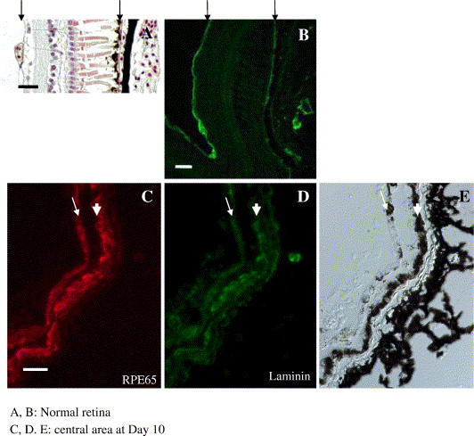 Fig. 3. Laminin and RPE65 distribution in regenerating retinas at Day 10 after retinectomy. (A) Normal Xenopus retina stained with hematoxylin and eosin. Two arrows indicate RVM (retinal vascular membrane) and Bruch's membrane. Both membrane structures are clearly immunoreactive for laminin as indicated by arrows in (B). (C, D, E) Retinectomized eye at Day 10. RPE65, laminin and Nomarsky differential image of the same area at the central (posterior) part of the eye. Arrows and arrowheads indicate the newly formed pigmented epithelium and the original RPE layer, respectively. Both layers are positively stained for RPE65 and laminin. Scale bars in A and B are 30 μm, and bar in C is 20 μm.