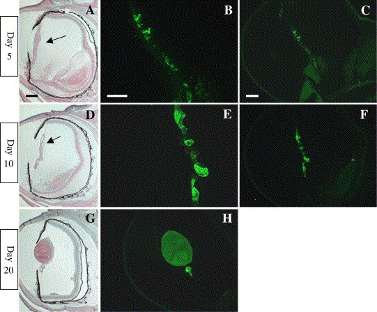 Fig. 9. Immunocytochemical detection of crystalline in regenerating lens in X. laevis eyes (4 months after metamorphosis). After lentectomy lens capsule-like structures are observed to adhere to the iris portion (arrows in A, D). (B, C) By Day 5 after lentectomy, some cells in the capsule are already positively stained with an antibody specific for newt lens. The stained cells are always located at the posterior side (B). (E, F) By Day 10 more cells are stained for crystalline. (G, H) By Day 20, the lens structure grows and shows a cuboidal shape. Lens fiber cells are stained intensely, while lens epithelium is devoid of staining. Scale bar in A is 200 μm and is applied to D, G. Scale bar in B is 50 μm and is applied to E. Scale bar in C is 100 μm and is applied to F, H.