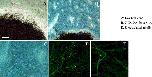 Fig. 8. Organotypic cultures of isolated RPE on Day 3 (A, D) and on Day 30 (B, C, E, F). RPE sheet was separated from the choroid and cultured on a filter membrane. (A, B, C) show cultures without FGF-2 and IGF-1, and (D, E, F) show cultures with both factors. (C, F) show BrdU labeling and (E) shows acetylated tubulin staining. In control cultures (A, B), RPE cells proliferated but remained mostly pigmented, while addition of FGF-2 and IGF-1 induces RPE cells to proliferate, depigment and differentiate into neural cells, as shown by acetylated tubulin immunocytochemistry (E). Arrows in B indicate the peripheral edge of the epithelial sheet. Scale bar in A is 20 μm and is applied to D. Scale bar in B is 30 μm and is applied to C, E, F.
