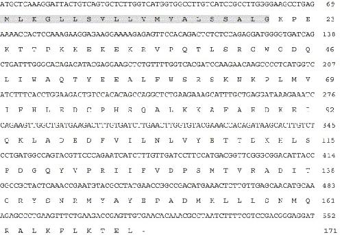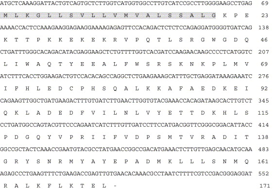 Fig. 1. Nucleic acid and the deduced amino acid sequences of zebrafish agr2. The putative signal peptide of zebrafish agr2 is shown in gray boxes. Numbers on the right indicate respective positions of nucleic acid and amino acid sequences.