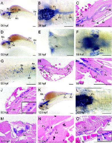 Fig. 5. Spatial mRNA expression patterns of agr2 during 96–120 h of development. agr2 was expressed in the otic vesicles of 96- (A), 98- (D, F), and 120-h post-fertilization (hpf) embryos (K, M). Expression of agr2 in mucous cells and anus was observed in 96- (A), 98- (D), and 120-hpf embryos (K). Expression of agr2 was detected in the olfactory bulbs of 96- (A), 98- embryos (E), and 120-hpf embryos (K). Expression of agr2 in the pharynx was observed from 96 to 120 h of development (A–D, F, H, I, K, L, and N). Expression of agr2 in the esophagus, and pneumatic duct was detected in 96-h (B and C) and 98- hpf embryos (D, H, and I). Expression of agr2 in the swim bladder can only be detected in 96-hpf embryos (B and C). Trace amount of agr2 expression in the esophagus can be observed in paraffin sections of 120-hpf embryos (N). agr2 was expressed in the goblet cells located in the mid-intestine region of 98- (D, G, H, and J) and 120-hpf embryos (K and O). Higher magnification view of agr2-expressing goblet cells was shown as insets in J and O, respectively. No expression of agr2 can be observed in the notochord of 96- (C) and 98-hpf embryos (H and I). Longitudinal paraffin sections of 96- (C), 98- (H–J), and 120-hpf embryos (M–O) revealed agr2 expression in the pharynx, esophagus, pneumatic duct, swim bladder, goblet cells, semicircular canal, and anus. All embryos are shown with the anterior to the left. Embryos in A, D, and K are shown in lateral view, embryos in B, G, and L are shown in ventral view, and embryos in E and F are shown in their dorsal view. Ae, anterior endoderm; an, anus; es, esophagus; hg, hatching gland; nt, notochord; ob, olfactory bulb; ov, otic vesicle; pd, pneumatic duct; ph, pharynx; sb, swim bladder; sc, semicircular canal. Bars represent 100 μm.