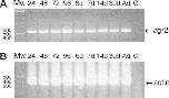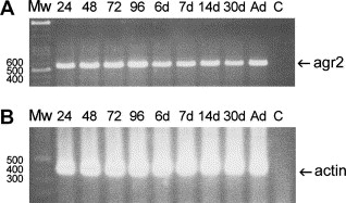 Fig. 6. Temporal expression pattern of agr2 during different developmental stages analyzed by RT-PCR. DNase I-treated total RNA isolated from 24-, 48-, 72-, and 96-h post-fertilization, 6-, 7-, 14-, 30-day post-fertilization, and adult fish (Ad) was used to conduct RT reaction. (A) An agr2-specific primer pair was used in PCR and resultant 510 bp PCR product was analyzed. (B) An α-actin-specific primer pair was used in PCR and amplified 350 bp DNA fragments were examined by agarose electrophoresis. No template controls (C) in respective PCRs were shown.