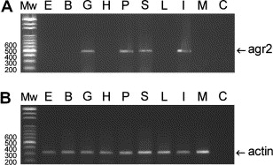 Fig. 7. Distribution of agr2 in different tissues or organs isolated from adult fish. DNase I-treated total RNA isolated from the eye (E), brain (B), gill (G), heart (H), pharynx/esophagus (P), swim bladder/pneumatic duct (S), liver (L), intestine (I), and muscle (M) was used to perform RT reaction. An agr2-specific primer pair was used in PCR and 510 bp amplified DNA fragments were analyzed and shown in A. An α-actin-specific primer pair was used in PCR and amplified 350 bp DNA fragments were examined and shown in B. No template controls (C) in respective PCRs were shown.