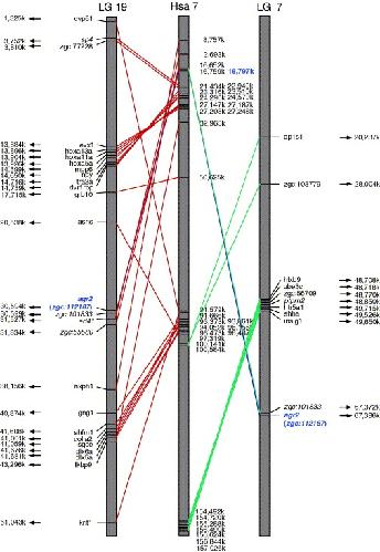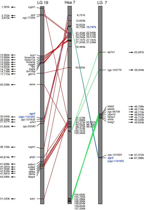 Fig. 8. Maps showing gene order with conserved syntenic groups between human chromosome 7 and respective zebrafish linkage group 7 and 19. Genes sharing equal or greater than 60% amino acid sequence identity and their start positions (million base pair) on respective zebrafish linkage group 7 (LG 7), 19 (LG 19), and human chromosome 7 (Hsa 7) are shown. The entire chromosome (grey box) is shown, but the scale is different in different chromosomes. Names of the zebrafish external gene ID are shown next to both zebrafish linkage group 7 and 19. Some zebrafish external gene IDs are italicized and they represent genes showing syntenic conservation with those in mouse chromosome 12 where Agr2 lies.