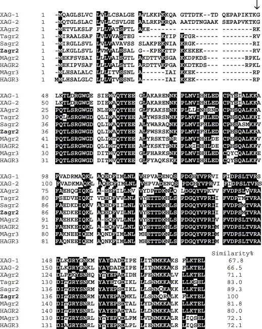 Fig. 2. Alignment of the amino acid sequence of zebrafish agr2 with other anterior gradient 2 homologues from the pufferfish, Atlantic salmon, Xenopus, human, and mouse. Identical amino acid sequences which are greater than or equal to seven are shown in black boxes. Gaps are introduced as represented by dots to optimize the alignment. An arrow indicates the residue used as the first N-terminal amino acid for phylogenetic analyses. The percentage of amino acid similarity between zebrafish agr2 and each homolog from other vertebrate organisms is shown. Sequences are pufferfish Tagr2 (Tetraodon nigroviridis; CAF94244); Atlantic salmon Sagr2 (Salmo salar; ABB96968); human HAGR2 (NM_006408) and HAGR3 (AY069977); mouse MAgr2 (BC013334) and MAgr3 (Q8R3W7); zebrafish Zagr2 (AY796218; this study); and Xenopus XAG-1 (U76752), XAG-2 (AF025474), and XAgr2 (AF314056).