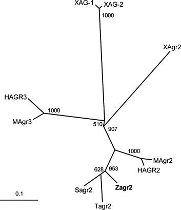 Fig. 3. Phylogenetic tree analyses of zebrafish agr2 and homologues from the pufferfish, Atlantic salmon, Xenopus, mouse, and human. A Neighbor-joining (NJ) tree is presented. The bar represents the number of estimated differences for a unit branch length. Bootstrap values are shown. Sequences used are pufferfish Tagr2 (Tetraodon nigroviridis; CAF94244); Atlantic salmon Sagr2 (Salmo salar; ABB96968); human HAGR2 (NM_006408) and HAGR3 (AY069977); mouse MAgr2 (BC013334) and MAgr3 (Q8R3W7); zebrafish Zagr2 (AY796218; this study); and Xenopus XAG-1 (U76752), XAG-2 (AF025474), and XAgr2 (AF314056).