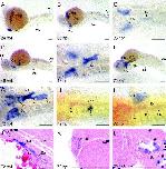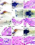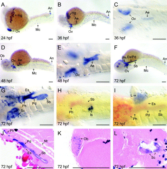 Fig. 4. Spatial mRNA expression patterns of agr2 during 24 to 72 h of development. agr2 was expressed in the otic vesicles of 24- (A), 36- (B and C), 48- (D and E), and 72-h post-fertilization (hpf) embryos (F, G). Expression of agr2 in mucous cells was observed in 24- (A), 36- (B), 48- (D), and 72-hpf embryos (F). agr2 was expressed in the hatching gland of 24- (A) and 36-hpf embryos (B). Expression of agr2 was detected in the olfactory bulbs of 48- (D) and 72-hpf embryos (K). agr2 was expressed in the anterior endoderm in 36- (B and C) and 48-hpf embryos (D and E). Expression of agr2 in the pharynx, esophagus, pneumatic duct, and swim bladder was detected in 72-hpf embryos (F and G). Images from two color double in situ hybridization using insulin (blue)/agr2 (red) (H) and LFABP (blue)/agr2 (red) (I) as probes are shown. Longitudinal paraffin sections of 72-hpf embryos revealed detailed expression of agr2 in the pharynx, pneumatic duct, esophagus, swim bladder (J), olfactory bulb (K), and semicircular canal of the inner ear (L). No expression of agr2 can be found in the notochord of 72-hpf embryos (J). All embryos are shown with the anterior to the left. Embryos in A, B, D, and F are shown in lateral view, while embryos in C, E, G, H, and I are shown in ventral view. Ae, anterior endoderm; an, anus; es, esophagus; hg, hatching gland; nt, notochord; ob, olfactory bulb; ov, otic vesicle; pd, pneumatic duct; ph, pharynx; sb, swim bladder; sc, semicircular canal. Bars represent 100 μm.
