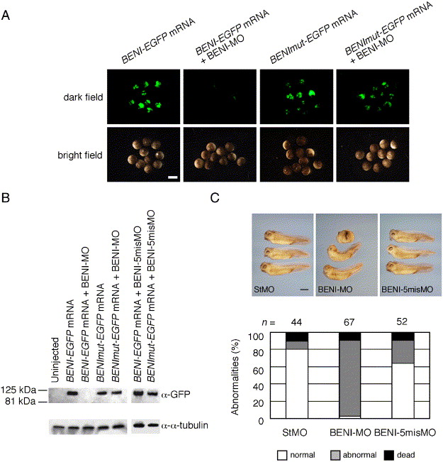 Fig. 3. Activity of BENI antisense morpholino oligonucleotide (BENI-MO). (A) BENI-EGFP (300 ng) or BENImut-EGFP (300 ng) was coinjected with BENI-MO (4 pmol = 34 ng) in the animal pole of Xenopus embryos. The embryos were raised until stage 9 and the EGFP was visualized and observed under a fluorescent microscope (A) and animal caps of the embryos were harvested for SDS-PAGE analysis. The animal cap lysates were subjected to SDS-PAGE and immunoblotted with anti-GFP and anti-α-tubulin (B). (C) Injection of BENI-MO (4 pmol = 34 ng) at both dorsal animal blastomeres of 4-cell embryos. The embryos were observed at stage 37/38. Scale bars, 1 mm.