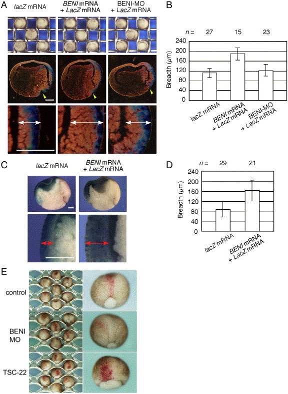 Fig. 4. Gastrulation defect caused by BENI mRNA. (A) lacZ mRNA (400 pg), BENI mRNA (1 ng) and lacZ mRNA, or BENI-MO (4 pmol = 34 ng) and lacZ mRNA were injected into both dorsoanimal blastomeres of 4-cell embryos. Vegetal view of embryos at stage 10 (top panels). There was no discernible delaying of gastrulation. Embryos were histologically examined and observed under diffuse light (middle panels). High magnification view of dorsal involuting marginal zone (IMZ) of the middle panels (bottom panels). Double-headed arrow indicates width of dorsal IMZ. Yellow arrowheads indicate the dorsal lip. Scale bar, 200 μm. (B) Width of dorsal IMZ was measured. (C) lacZ mRNA or BENI mRNA and lacZ mRNA was injected into both ventroanimal blastomeres of 4-cell embryos. Embryos were bisected at stage 10 (top panels). Highly magnified ventralIMZ of top panels (bottom panels). Double-headed arrow indicates width of ventralIMZ. Scale bar, 200 μm. (D) Width of ventralIMZ was measured. (E) lacZ mRNA (control, upper column), lacZ mRNA and BENI MO (middle column), and lacZ mRNA and TSC-22 mRNA (lower column) were injected into dorsoanimal blastomeres of 4-cell embryos. At stage 13, embryos were stained with Red-gal and the staining pattern observed.