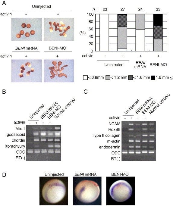 Fig. 5. BENI is involved in gastrulation movements and affects the expression of Xbra both in vitro and in vivo, but does not modulate cell differentiation. (A) The BENI mRNA inhibits elongation of animal cap explants in response to activin. Four-cell embryos were injected with the BENI mRNA (1 ng) or the BENI-MO (4 pmol = 34 ng). Animal caps from uninjected or injected embryos were left untreated or treated with 25 ng/ml activin and cultured for 12 h. Control caps remained round. (B) BENI regulates the expression of Xbra in vitro. Four-cell embryos were injected with the BENI mRNA or the BENI-MO. Animal caps from uninjected or injected embryos were left untreated or treated with 25 ng/ml activin and cultured for 3 h. The animal caps were analyzed by RT-PCR. Mix. 1 (mesoendodermal marker), goosecoid, and Chordin (dorsal mesodermal marker), Xbra (pan-mesodermal marker) were examined. ODC served as a loading control. No signal was observed in the absence of reverse transcriptase [RT(â)]. (D) Neither BENI mRNA nor BENI-MO altered the expression of the marker genes. The animal caps were analyzed by RT-PCR. NCAM (neural marker), Hox B9 (spinal chord marker) type II collagen (notochord marker), muscle actin (m-actin) (muscle marker), and endodermin (endoderm marker) were examined. ODC served as a loading control. No signal was observed in the absence of reverse transcriptase [RT(â)]. (E) BENI mRNA reduced the expression of Xbra in vivo. Spatial expression pattern of Xbra at stage 10.5 detected by whole-mount in situ hybridization. BENI mRNA (300 pg) or the BENI-MO (4 pmol = 34 ng), together with lacZ mRNA (300 pg), was injected at the 4-cell stage into both dorsal blastomeres. β-galactosidase activity was visualized with Red-gal substrate as a tracer. Embryos were viewed from the vegetal side.