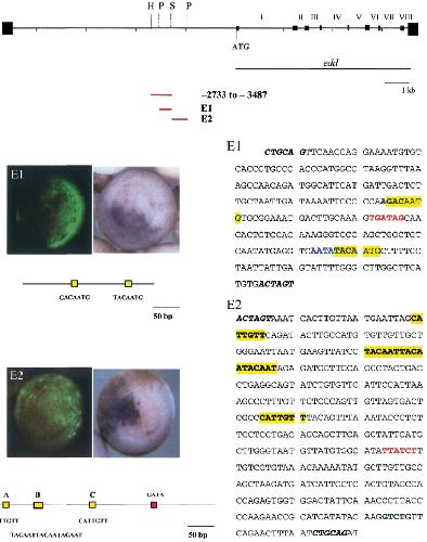 of E and E2, indicating Sox-binding sites (yellow boxes, contained