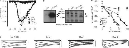 Figure 1. Dose-dependent inhibition of CaV1.2 channels by Gem and Rem2. (A) Normalized I-V relationships of IBa from oocytes injected with α1C/β3/α2δ without or with Gem (130 pg) or Rem2 (936 pg). n = 5. (B) Immunoblots with anti-Gem antibody. On left is shown GST and GST-Gem, demonstrating specificity of the antibody. The right panel shows an increase in the amount of Gem protein detected with an increasing amount (as indicated) of cRNA injected per oocyte. Gem is indicated by an arrow; a nonspecific band seen even without injection of Gem cRNA is shown by an asterisk. (C) Dose–response of Gem-, Rem-, or Rem2-mediated inhibition of IBa. KChIP2b cRNA was injected as a negative control. n = 5–7. (D) Exemplar traces of CaV1.2 channels expressed without a RGK, with Gem (20 pg), with Rem (100 pg), or with Rem2 (468 pg). Bars: 1 s and 1 μA.