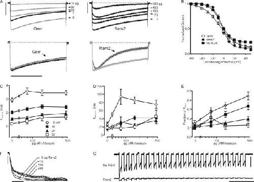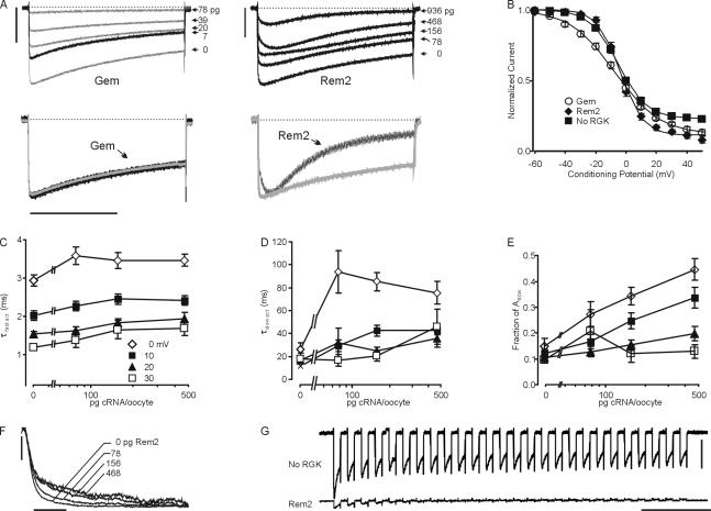 Figure 2. Rem2 affects channel activation and inactivation. (A) Top panels show exemplar current traces during a 2-s test pulse at +10 mV for Gem and Rem2 at the indicated doses. Bars, 1 μA. The bottom panels show scaled exemplar traces of α1C/β3/α2δ (gray) coinjected with Gem (65 pg) or Rem2 (936 pg) (black) during a 2-s test pulse to +10 mV. (B) Steady-state inactivation for α1C/β3/α2δ without or with Gem (26 pg) or Rem2 (936 pg). n = 10–12 (C–E) Dose–response of Rem2-mediated effects upon kinetics of activation (τfast, fraction Aslow, and τslow, respectively, at the indicated test potentials—see legend in C—and with the amounts of cRNA injected as indicated on the x-axis), n = 7–14. (F) Scaled exemplar traces of activation phases at +10 mV for α1C/β3/α2δ coexpressed with the indicated Rem2 doses. Bar, 10 ms. (G) Ca2+ currents recorded during a simulated burst of action potentials in a pancreatic β cell (see Materials and methods) with no RGK or Rem2 (468 pg). Bars: 200 nA, 1 s.
