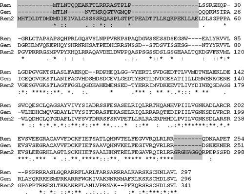 Figure 5. Rem2 has extended termini. CLUSTAL W (1.83) multiple sequence alignment (Thompson et al., 1994) of Rem, Gem, and Rem2. The gray-boxed areas highlight the extended N and C termini in Rem2 that flank the conserved Ras-like core.