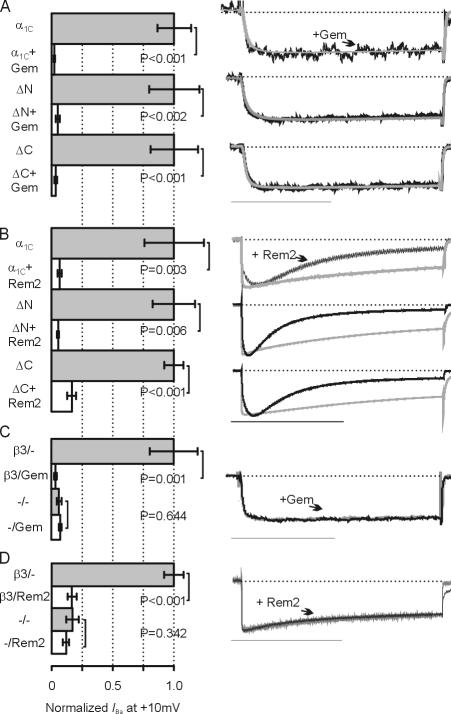 Figure 3. The Ca2+ channel β subunit, but not the α1C N and C termini, are required for Gem- or Rem2-mediated effects. (A and B) Normalized IBa for the indicated combinations of α1C (WT), the N-terminal truncation (ΔN), or the C-terminal truncation (ΔC), with or with Gem or Rem2, as indicated. All combinations were coexpressed with β3 and α2δ. Scaled exemplar current for each pair with (black) or without (gray) Gem or Rem2 are shown on right. n = 5–9. Bars: 50 ms (A) and 1 s (B). (C and D) Normalized IBa for the indicated combinations of ΔC and α2δ with or without β3 and Gem or Rem2, as indicated. For the pair without β3, scaled exemplar currents with (black) or without (gray) Gem or Rem2 are shown on right. n = 5. Scale bars as above.