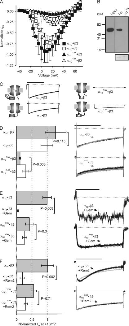 Figure 4. Interaction between the Ca2+ channel β subunits and the AID influence Gem- and Rem2-mediated effects. (A) Normalized I-V relationships of IBa from oocytes injected with the indicated constructs or combinations, all coinjected with α2δ. n = 31–34. (B) A Hisx6 immunoblot of a pull-down experiment for purified β2 SH3-GK core (Maltez et al., 2005) using a GST-α1C I-II or I-IIYW mutant loop. Coomassie-stained gel below shows equal loading of the GST fusion proteins. (C) Exemplar traces and models of the indicated concatemers or combinations. Bars: 1 s, 4 μA. (D–F) Normalized IBa for the indicated concatemers or combinations (all expressed with α2δ), with or without Gem or Rem2. Scaled exemplar traces are shown on right. n = 5. Bars: 1 s (D and F) and 50 ms (E).