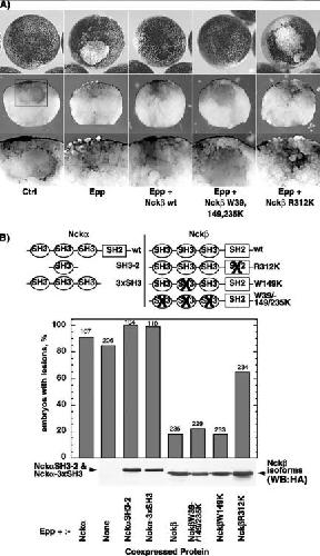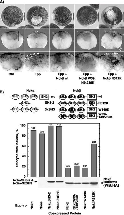 Figure 1. Nckβ overexpression rescues the Epp loss-of-adhesion phenotype. (A) Example of a lesion caused by loss of animal pole blastomere adhesion resulting from the expression of Epp. Examples of rescue of this phenotype by the coexpression of Nckβ forms are also shown. The middle panels show corresponding manually cross-sectioned embryos, and the boxed regions are shown at higher magnification in the bottom panels. (B) The structure of Nckα and Nckβ and their mutant forms is shown above a histogram of the percentage of embryos displaying loss-of-adhesion lesions. Scoring was on the basis of visible lesions; no correction for lesion size was made. The ratio of Epp to Nck RNA injected was maintained at 1-4. The numbers above the histogram columns refer to the total number of embryos scored. The bottom panel shows the relative Nckβ and Nckα SH3-2 and 3xSH3 expression levels determined by Western analysis using an antibody against the HA epitope tag. Nckα wild type (wt) was not tagged and hence could not be detected in this way. |