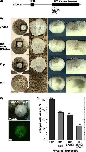Figure 4. xPAK1 induces the loss-of-adhesion phenotype that can be suppressed by C-cadherin. (A) xPAK1 domain structure indicating the ATP binding site mutation used to inactivate the kinase domain. (B) Left panel shows examples of control embryos and embryos displaying loss of blastomere adhesion induced by xPAK1 or the KD mutant in comparison with the activated EphA4 (Epp) phenotype. The corresponding boxed regions are shown at higher magnification in the middle-left panels. The middle-right panels show manually cross-sectioned embryos, and the corresponding boxed regions are shown at higher magnification in the right panels. (C) Coexpression of xPAK1 with GFP shows that the effect of xPAK1 is restricted to the expressing cells. Visible and UV refer to incident and fluorescent light images, respectively. (D) Epp and KD-xPAK1 RNAs were coinjected with or without C-cadherin RNA, and loss-of-adhesion lesions was scored. The ratio of Epp or xPAK1 to cadherin RNA was maintained at 1-4. Scoring was on the basis of visible lesions; no correction for lesion size was made. The numbers above the histogram columns refer to the total number of embryos scored. |