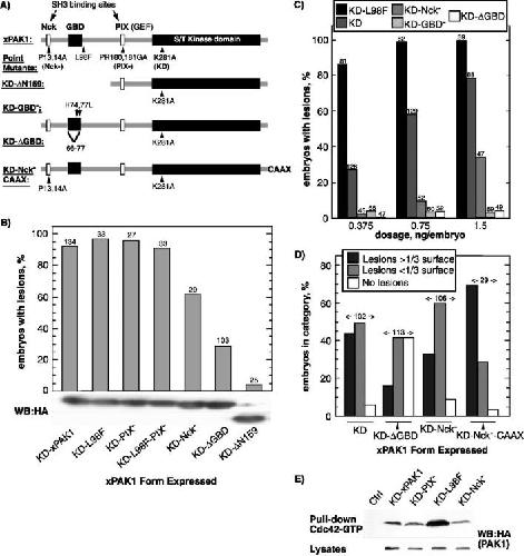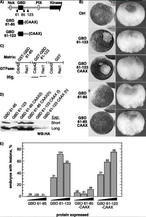 Figure 6. The functional GBD of xPAK1 is sufficient to induce the loss-of-adhesion phenotype, but its function is enhanced by membrane targeting. (A) The structure of the GBD constructs (xPAK1 a.a. 61-85 and a.a. 61-123). (B) Phenotype of the GBD-induced lesions, left panels show external animal pole views, and right panels show sections through the lesions. (C) Binding of in vitro-translated GTP-charged wild type Cdc42 and Rac1 GTPases to the GST-immobilized xPAK1 GBDs 61-85 and 61-123. (D) Western analysis of expression levels of the GBD constructs using an antibody to the common HA epitope-tag (h embryos in 1Ã MMR and l embryos in 0.1Ã MMR). Two exposures of the same analysis are shown to increase the visible dynamic range. (E) Statistical analysis of lesion penetrance. Embryos were injected in parallel with 70, 200, or 400 pg of GBD 61-123 and GBD 61-123-CAAX RNAs. Embryos displaying obvious lesions, irrespective of size, were scored. Total number of embryos analyzed is shown above each column. In B and D, each embryo was injected with 200 pg of mutant RNA. |