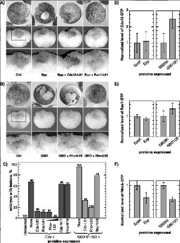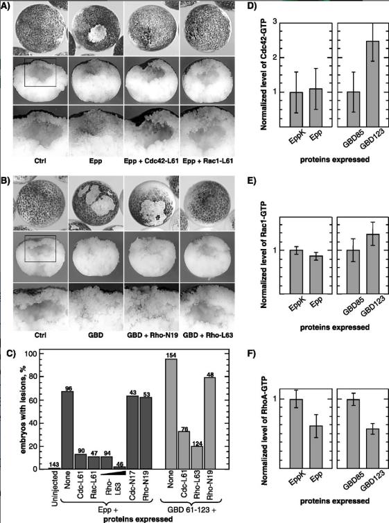 Figure 7. Activated Cdc42, Rac1, and RhoA rescue EphA4 induced loss-of-adhesion. (A) Epp RNA was coinjected with activated Cdc42 or Rac1 GTPases RNA (ratio 1:3) at the two-cell stage. Lower panels show corresponding sections of embryos in top panels, and corresponding boxed regions are shown at higher magnification in the bottom panels. (B) As in A, but the xPAK1-GBD 61-123 was coinjected either alone or with dominant-negative (N19) or activated RhoA (L63) (ratio 1:2). Bottom panels show sections of the corresponding embryos, and corresponding boxed regions are shown at higher magnification in the bottom panels. Typical examples of resulting embryos are shown. See Supplemental Figure 1 for sample images of dominant-negative GTPase coinjection. (C) Quantitation of Epp and GBD rescue with active and dominant-negative forms of Cdc42, Rac1, and RhoA. The numbers above the histogram columns refer the total number of embryos scored. (D) Levels of active (GTP-bound) Cdc42 in embryos expressing Epp or EppK (kinase dead Epp that does not give the loss-of-adhesion phenotype) and xPAK1 GBD constructs. Active Cdc42 levels were measured by pull-down with the xPAK1 GBD. The average of three experiments is shown. (E) Levels of active (GTP-bound) Rac1, measured as in D. The average of two experiments is shown. (F) Levels of active (GTP-bound) RhoA in embryos expressing Epp or EppK or xPAK1 GBD constructs. Active RhoA levels were measured by pull-down with the rhotekin GBD. The average of two experiments is shown. |