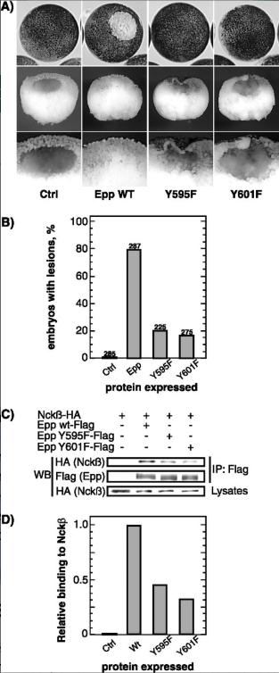 Figure 2. Tyrosines 595 and 601 on EphA4 are essential for the loss-of-adhesion phenotype and for Nckβ interaction. (A) Example of a lesion caused by loss of animal pole blastomere adhesion resulting from the expression of Epp and block of this phenotype by independent mutagenesis of two conserved tyrosines in the juxtamembrane domain. (B) Histogram of the percentage of embryos displaying loss-of-adhesion lesions. Scoring was on the basis of visible lesions, no correction for lesion size was made. The same amount of RNA was injected for wild-type (wt) or mutant Epp. The numbers above the histogram columns refer to the total number of embryos scored over three independent experiments. (C) Interaction of xEpp with Nckβ. HA-Nckβ and xEpp-FLAG (wt or mutants) were transfected in 293T cells, and total protein extracts were immunoprecipitated with anti-FLAG antibody, Western blotted, and probed with anti-HA antibody. (D) The data in C were quantified and are shown normalized to the wt EppâNckβ interaction levels. |