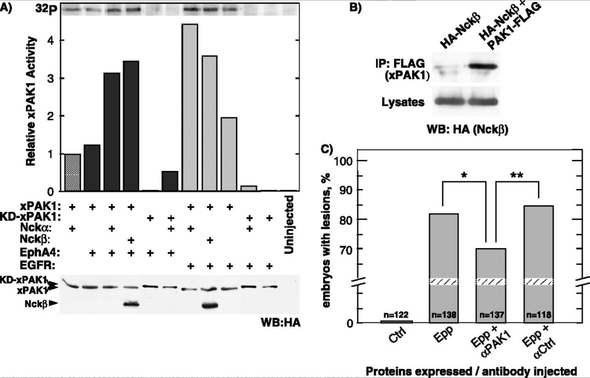 Figure 3. xPAK1 is activated by EphA4 in embryo. (A) Assay of xPAK1 kinase activity in extracts from embryos coexpressing xPAK1 or a catalytically inactive xPAK1 (KD-xPAK1), the receptors EphA4 or hEGFR and the two Nck isoforms. Relative xPAK1 and Nckβ expression were determined by Western analysis by using an antibody to the HA epitope-tag. Nckα was not epitope tagged and so was not detected in this assay. (B) Interaction of xPAK1 with Nckβ. HA-Nckβ and xPAK1-FLAG were transfected in 293T cells, and total protein extracts were immunoprecipitated with anti-FLAG antibody, Western blotted, and probed with anti-HA antibody. (C) xPAK1 is required for loss-of-adhesion. Histogram showing the percentage of embryos displaying loss-of-adhesion lesions when injected with Epp alone or when coinjected with an affinity-purified anti-xPAK1 (αPAK1) antibody or a control antibody (αCtrl). Scoring was on the basis of visible lesions, no correction for lesion size was made. Statistical analysis showed that differences were significant; *p = 0.0199 and **p = 0.0106. |