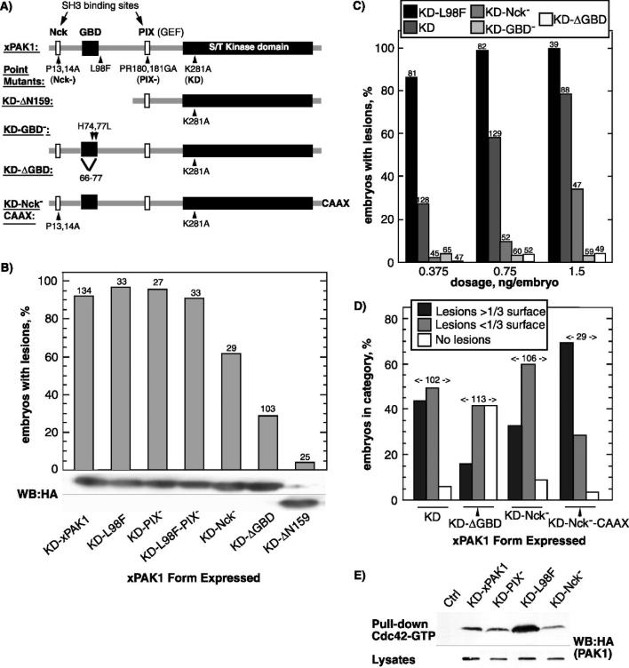 Figure 5. The xPAK1 loss-of-adhesion phenotype requires the GBD and is enhanced by the Nck binding site and by CAAX targeted membrane recruitment. (A) The structure of the xPAK1 mutants used. Amino acid mutations and the extent of deletion mutations are indicated as is the C-terminal CAAX extension. (B) Each xPAK1 mutant was injected and loss-of-adhesion lesions were scored. RNA injections were adjusted to give a high penetrance of the KD-xPAK1âinduced phenotype, and this same amount of each mutant RNA was then injected. Bottom panel shows relative protein expression levels as determined by Western analysis by using an antibody to the HA epitope-tag. Two regions of the same Western analysis are shown. (C) Doseâresponse relationship for increasing amounts of injected KD-L98F, KDâ, KD-Nckâ, KD-GBDâ, and KD-ÎGBD-xPAK1 RNAs. Scoring was regardless of lesion size. (D) Comparison of lesion size. Equal RNA amounts of each mutant were injected, and the sizes of loss-of-adhesion lesions were categorized relative to the total animal pole surface. The numbers above the histogram columns refer to the total number of embryos scored. (E) KD-L98F xPAK1 displays an increased affinity for GTP-Cdc42. HA-tagged xPAK1 constructs were expressed in embryo, whole extracts applied to Sepharose-bound GST-Cdc42 fusion protein precharged with GTP, and revealed by Western blotting by using the HA epitope tag. |