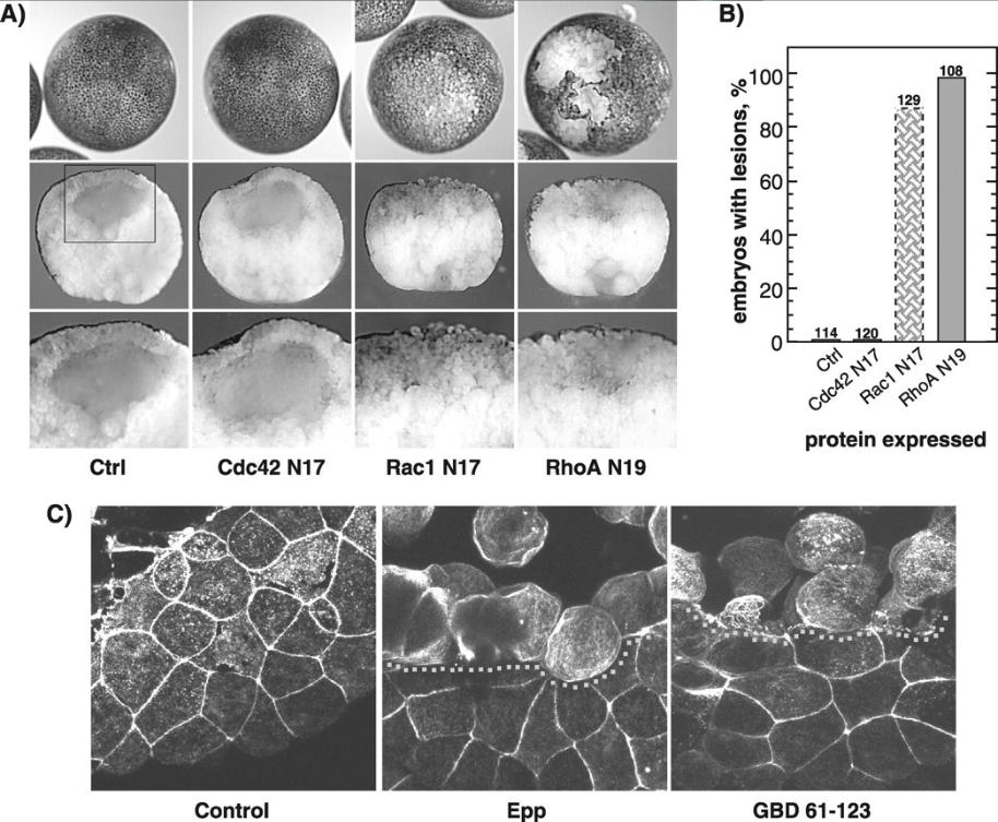 Figure 8. DN-RhoA and DN-Rac1 also induce loss-of-adhesion. (A) Phenotypes of the DN-Cdc42 (N17), DN-Rac1 (N17), and DN-RhoA (N19) expression in embryo. Top panels show external animal pole views, middle panels show sections through the lesions, and corresponding boxed regions are shown at higher magnification in the bottom panels. Typical examples of resulting embryos are shown. (B) Histogram of the percentage of embryos displaying loss-of-adhesion lesions. Scoring was on the basis of visible lesions; no correction for lesion size was made. The same amount of GTPases was injected for all mutants. The numbers above the histogram columns refer to the total number of embryos scored over two independent experiments. For DN-Rac1, the shaded bar represents the penetrance of the distinct phenotype shown in A. (C) Confocal imaging of the actin cytoskeleton in a phalloidin-stained control embryo and in embryos undergoing Epp and xPAK1-GBD (61-123) loss-of-adhesion. The boundary of the loss-of-adhesion lesion is indicated by a dotted line. |