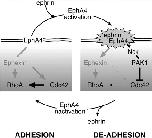 Figure 9. Schematic diagram describing the probable mechanisms of induction of the loss-of-adhesion lesions by EphA4. Pointed arrowed lines show activating and blunt ended lines inhibitory signaling and line density indicates signaling strength. |