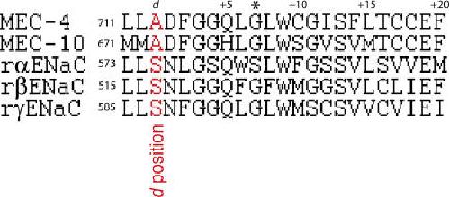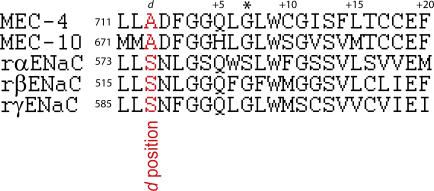 Figure 1. The peri-TM2 domain of MEC-4, MEC-10, and rat ENaCs. The d position is highlighted in red. In 267 proteins from 36 species in the DEG/ENaC superfamily, the d position is occupied by S > A > G > N in descending order of frequency (Bateman et al., 2004). Residues n after the d position are labeled d + n as referenced in the text. Residue d+7 is indicated with *; mutations at this position in ENaC decrease amiloride Ki' by ∼1,000-fold (Schild et al., 1997).