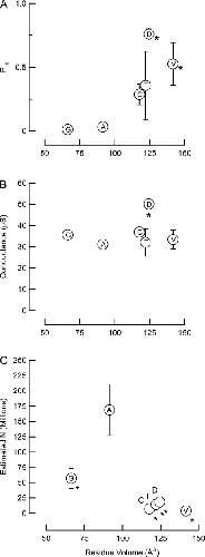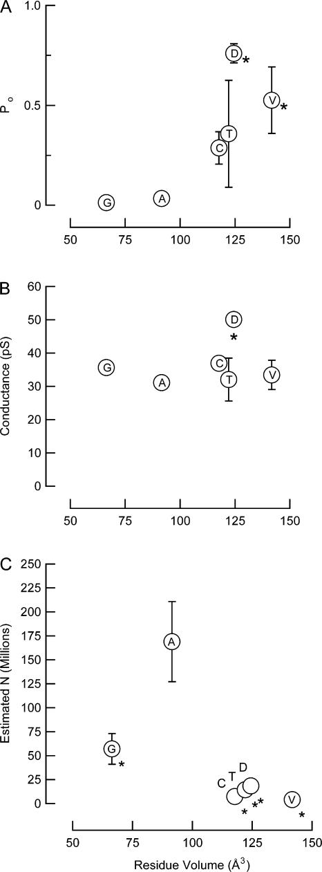 Figure 3. Steady-state open probability, Po (A), single-channel conductance, γ (B), and estimated channel number, N (C), as a function of side-chain volume. Microscopic parameters, Po and γ, were determined from outside-out patches containing one to two channels. The square root of the probability of not being closed was used as an estimate of Po for two-channel patches. N was estimated as described in the Results. The data are summarized in Table II. One-way ANOVAs for Po, γ, and N were as follows: F(5,46) = 8.354, P = 1.11e-05; F(5,46) = 6.791, P = 8.12e-05; and F(5, 97) = 12.94, P = 1.2e-09. Pairwise Dunnet's test with respect to wild-type: *, P < 0.01.