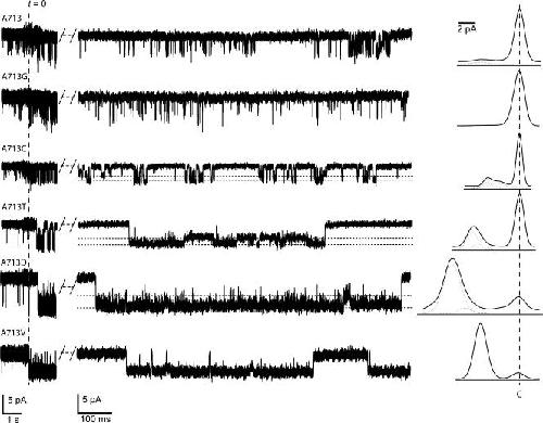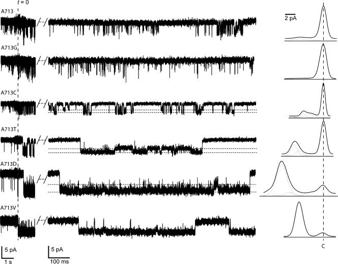 Figure 4. Single-channel recordings of A713X isoforms at −150 mV. Inward current is down and substates are indicated by a horizontal dashed line. To the left of each trace is a segment of the same recording (displayed on a compressed timescale) showing current in the presence (t < 0) and absence (t > 0) of 50 μM amiloride. All-points histograms are to the right of each trace, including fits to the distribution with a sum of Gaussians. The peak corresponding to the closed state is indicated by the vertical dashed line. Similar results were obtained in at least four patches for each isoform.