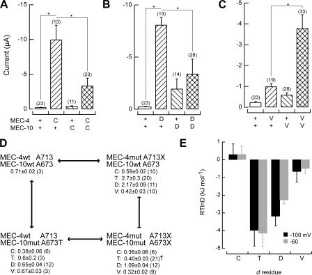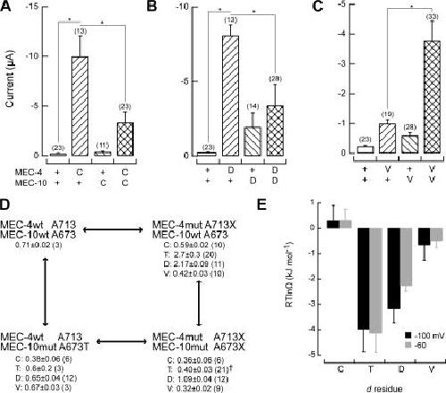 Figure 7. Macroscopic current and amiloride block of MEC-4/MEC-10 heteromultimeric channels. (A) Amiloride-sensitive current in wild type, cysteine single-mutant, and cysteine double-mutant heteromeric channels. (B) Amiloride-sensitive current in wild type, aspartate single-mutant, and aspartate double-mutant heteromeric channels. (C) Amiloride-sensitive current in wild type, valine single-mutant, and valine-double mutant heteromeric channels. In A–C, bars are mean ± SEM for the number of cells indicated above each bar. For ease of comparison, data for wild-type heteromeric channels are repeated in A–C. *, P < 0.01, Student's t test for the indicated comparison. (D) Schematic diagram of the mutant cycle, including Ki' measured at −60 mV for each combination. Values are mean ± SEM (in μM) for the number of measurements indicated in parenthesis. (E) Coupling energy, RTlnΩ, for mutations that replace the wild-type alanine with C, T, D, or V in MEC-4 and MEC-10. One-way ANOVA showed that the four Ki values used to calculate each Ω differed from one another at P < 0.0005. See Table S1 for Ki' values and Table S2 for full results of the ANOVA. †, data are from Goodman et al. (2002).