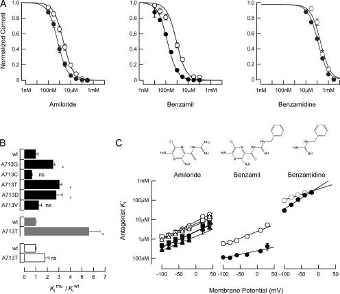 Figure 5. Steady-state blockade by amiloride-related compounds. (A) Normalized dose–response curves at −60 mV for amiloride (left), benzamil (center), and benzamidine (right). Solid and open circles are data for A713wt and A713T channels, respectively. (B) Effect of mutation on Ki' at −60 mV. (C) Antagonist Ki' vs. voltage. Six A713X isoforms were tested for amiloride blockade: solid circles (A713wt), solid squares (A713V), and solid triangles (A713C); open circles (A713T), open squares (A713D), and open triangles (A713G). Curves were fit to the data according to Woodhull's model of voltage- dependent blockade by charged molecules (Woodhull, 1973). See Table II for fitting parameters and the number of oocytes tested for each isoform and compound.