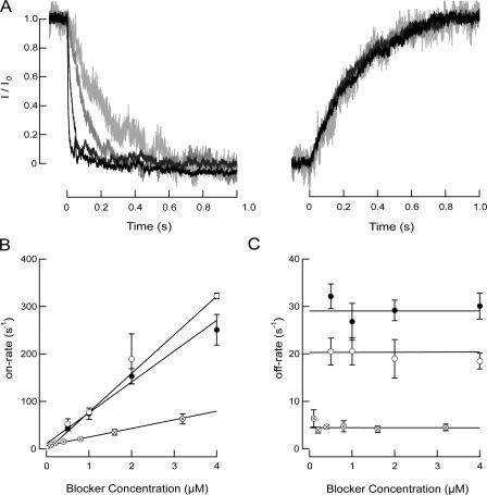 Figure 6. Kinetics of blockade by amiloride-related compounds. (A) Time course of the effect of benzamil on A713wt in outside-out macropatches. Vh = −60 mV. Traces corresponding to the effect of 0.1, 0.4, 1.6, and 20 μM benzamil are shown and shaded in proportion to the concentration. (B) On-rates depend on concentration, voltage, and compound. Closed circles are amiloride at Vh = −60 mV (n = 6), open circles are amiloride at Vh = −100 mV (n = 3), hatched circles are benzamil at Vh = −60 mV. (C) Off-rates depend on voltage and compound, but not concentration. All points are mean ± SEM; lines are fits to averages weighted by the standard deviations.
