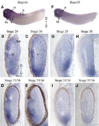 Fig. 3. Distribution of type I Bmp receptor transcripts in the developing Xenopus eye. (A) Wholemount in situ hybridization of a stage 28 embryo using a BmprIa antisense probe. (B-E) Transverse sections through the retinas of Xenopus embryos processed for BmprIa in situ hybridization, at stages 28 (B), 30 (C), 33/34 (D) and 35/36 (E). * in (C) is the forming RGCL. (F) Bmpr1b wholemount in situ hybridization of a stage 30 embryo. (G-J) Transverse retinal sections through stage 28 (G), 30 (H), 33/34 (I) and 35/36 (J) embryos show expression of BmprIb. Scale bar in (B) is 50 μm for (B-E) and (G-J). Abbreviations: D, dorsal; V, ventral; ba, branchial arches; e, eye; k, kidney; is, intersomitic region; L, lens; nr, neural retina; ot, otic vesicle; rpe, retinal pigment epithelium.