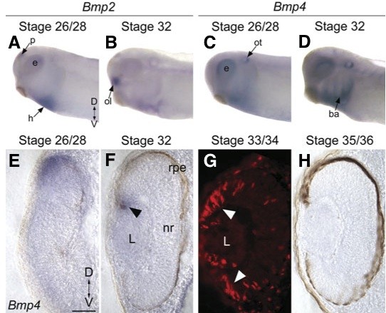 Fig. 1. Bmp4 mRNA, but not Bmp2, is expressed in the forming Xenopus retina. (A,B) Spatial expression of Bmp2 mRNA in Xenopus embryos processed for wholemount in situ hybridization using digoxige- nin-labeled riboprobe. Lateral views of stage 26/28 (A) and stage 32 (B) embryos. (C,D) Expression of Bmp4 mRNA in wholemount embryos at stages 26/28 (C) and 32 (D). (E,F,H) Transverse sections through retinas of embryos processed for Bmp4 in situ hybridization at stages 26/28 (E), 32 (F) and 35/36 (H). (G) Immunolabeling of BrdU that has incorporated into dividing cells at stage 33/34 shows the location of the ciliary marginal zone (CMZ; white arrowheads), a proliferative region adjacent to the lens. Compare with Bmp4 expression (black arrowhead) at stage 32 (F). Anterior is to the left in panels (A-D). Scale bar in (E) is 50 μm for (E-H). Abbreviations: D, dorsal; V, ventral; ba, branchial arches; e, eye; h, heart; L, lens; nr, neural retina; p, pineal gland; ol, olfactory pits; ot, otic vesicle; rpe, retinal pigmented epithelium.