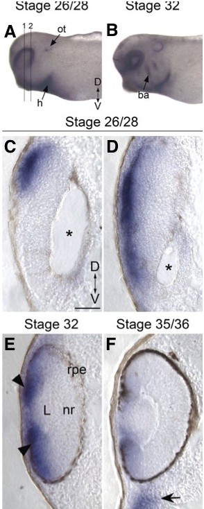 Fig.2. Expression of Bmp7 mRNA in the Xenopus retina during development. (A,B) Xenopus embryos processed for wholemount in situ hybridization with Bmp7 antisense riboprobe at stages 26/28 (A) and 32 (B). (C) Transverse section through the central portion of the optic vesicle of a stage 26/28 embryo labeled for Bmp7 mRNA (see line 1 in A). (D) Transverse section through the peripheral retina of stage 26/28 embryo (line 2 in A) reveals expression of Bmp7 mRNA along the entire dorsoventral axis. (E) Transverse section through a stage 32 embryo shows Bmp7 expression in the dorsal and ventral CMZ (black arrowheads). (F) A patch of Bmp7 expression (arrow) appears in the mesenchymeventral to the EF retina at stage 35/36. Anterior is to the left in panels (A,B). Scale bar in (C) for panels (C-F) is 50 μm. * in (C,D) shows the location of the interior of the optic vesicle prior to invagination of the optic cup. D, dorsal; V, ventral; ba, branchial arches; h, heart; L, lens; nr, neural retina; ot, otic vesicle; rpe, retinal pigment epithelium.