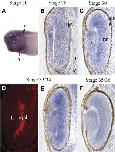 Fig. 4. Expression of BmprII mRNA in the developing Xenopus eye. (A) Stage 30 Xenopus embryo processed for BmprII in situ hybridization. BmprII transcripts are expressed in the eye (outlined by dotted line). (B,C, E,F) Ubiquitous expression of BmprII mRNA in the stage 28 retina (B) becomes refined to the inner layers of the neural retina and the lens at stage 30 (C), 33/34 (E) and 35/36 (F). Expression is absent from the emerging photoreceptors in the outer nuclear layer (onl). (D) A retina immunolabeled for Islet-1 shows the location of the RGCs in the inner- most layer of a stage 33/34 retina. Scale bar in (B) is 50 μm for panels (B- F). Abbreviations: D, dorsal; V, ventral; h, heart; L, lens; nr, neural retina; onl, outer nuclear layer; ot, otic vesicle; rgcl, retinal ganglion cell layer; rpe, retinal pigment epithelium.
