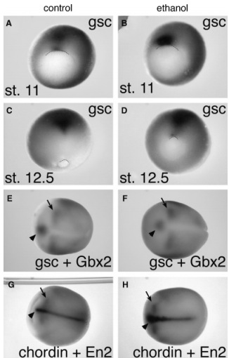 (E) Control and (F) EtOH-exposed embryos studied with the gsc