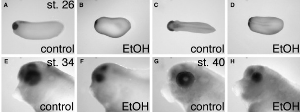 EtOH treatment. Control (A, C, E, G) and 2.5% ethanol (EtOH;vol/vol)-treated embryos (B, D, F, H) were allowed to develop to stages 26 (AâD), 34 (E, F) and 40 (G, H) and, subsequently, processed for in situ hybridization with a probe specific for the eye gene, Pax6. Panels (A, B, EâH) are lateral views, panels (C, D) are dorsal views. Anterior is to the left.