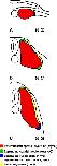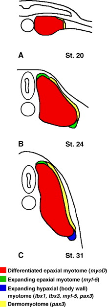 Fig. 1. Schematic illustrating early myotome growth in anterior-most somites. At stage 20, anterior-most somites that will contribute to the hypaxial body wall muscle have already undergone an initial phase of myf-5 expression and have differentiated to form the primary epaxial myotome (A). Subsequent expansion of the epaxial myotome occurs in the dorsal and ventral domains of the somites (B). At later stages, the ventral region contributes myoblasts to the hypaxial body wall muscles (C).