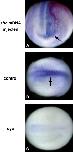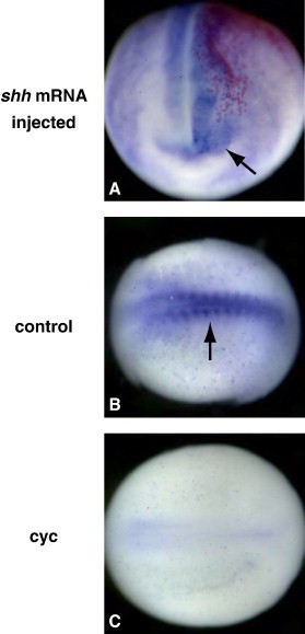 Fig. 2. Hh manipulations affect patched expression. A stage 20 embryo that was injected in one cell at the 2-cell stage with shh mRNA exhibits increased ptc-2 expression on the injected side (A, anterior view, arrow). A stage 20 control-treated embryo shows normal ptc-2 expression in the somites (B, arrow), which is lost in a cyclopamine-treated sibling (C).